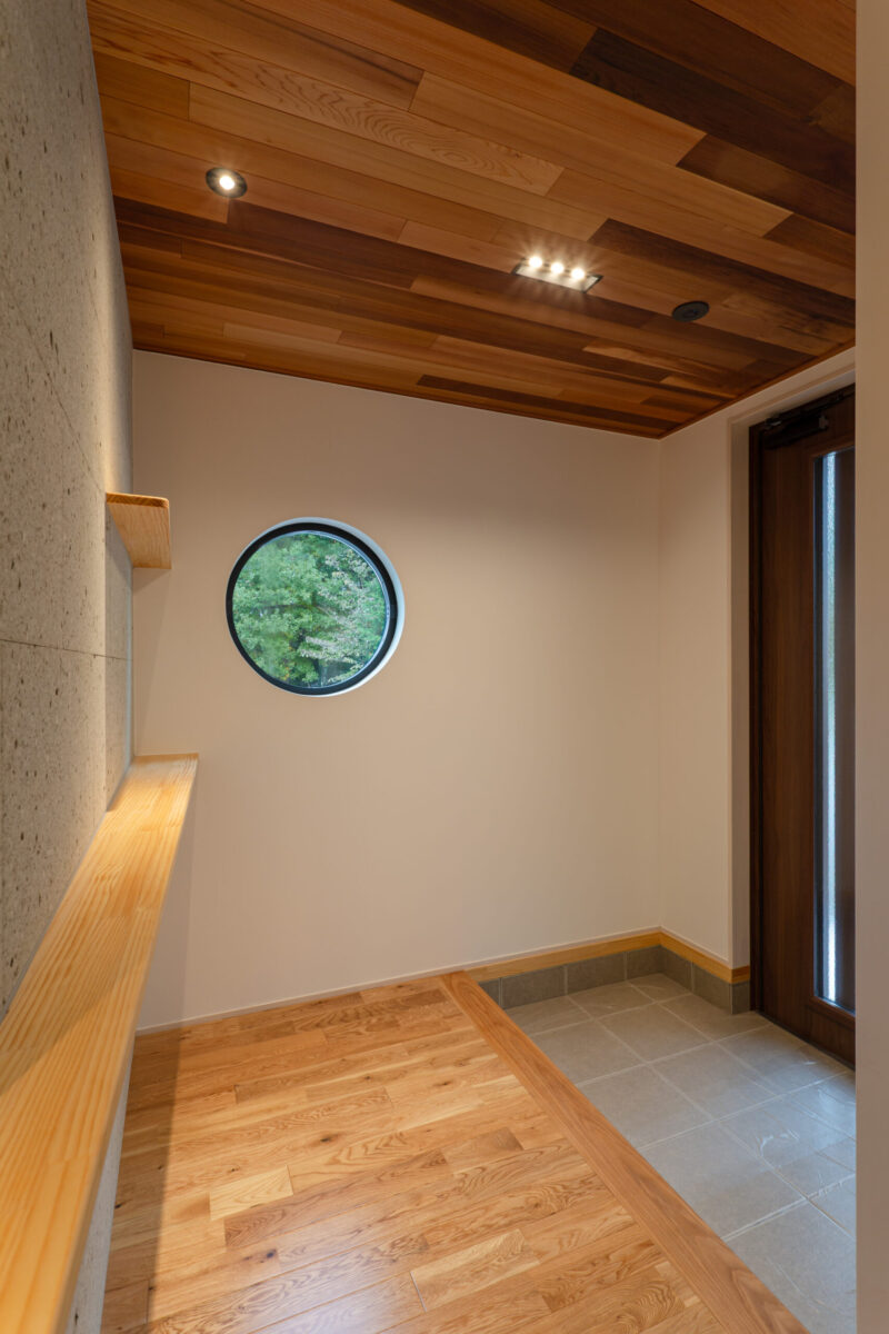 丸窓からのやわらかな景色と、天井に広がる木の表情が美しい玄関。大谷石と木のぬくもりが調和し、上質な仲まいに仕上げました。