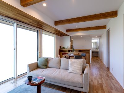 木づかいの家、薄井工務店の注文住宅。今回は夫婦2人で伸びやかに暮らす、木の香が芳しい平屋のお宅をご紹介します。ゆるやかな屋根の勾配を活かした吹上天井には、渋い色あいの梁を山小屋のように渡してい