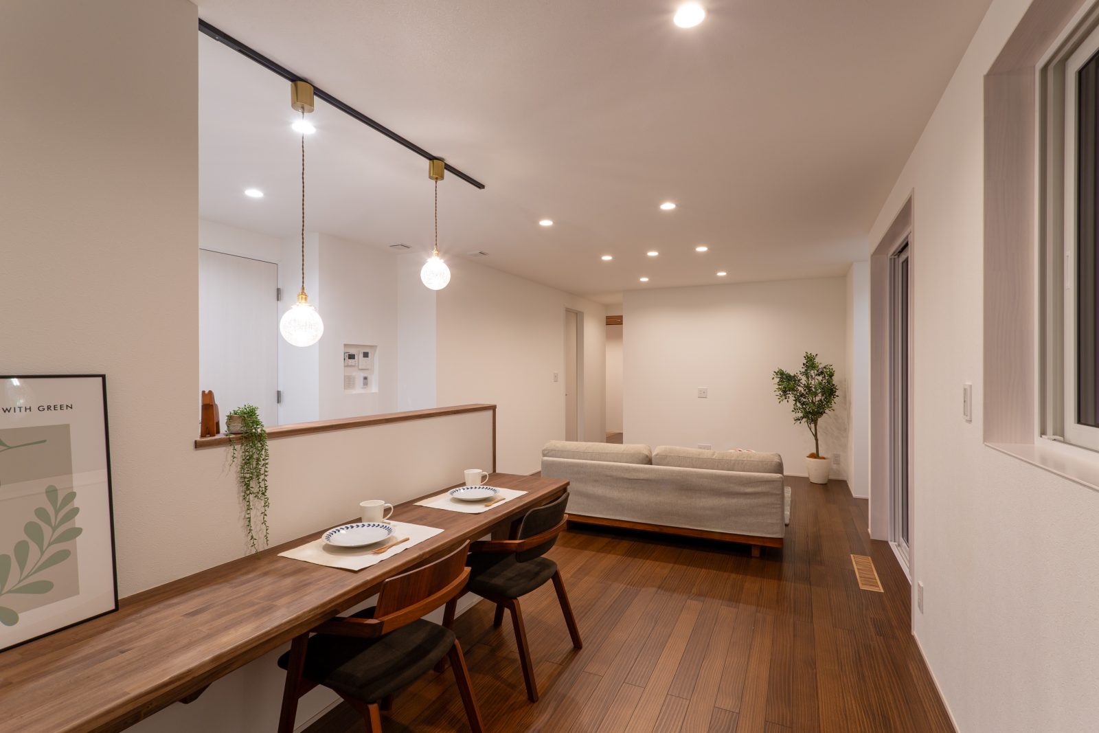 工夫した間取りで生活感を感じさせない、すっきりとしたシンプルなリビング 平屋ならではのステップフリーで居心地のいい空間に