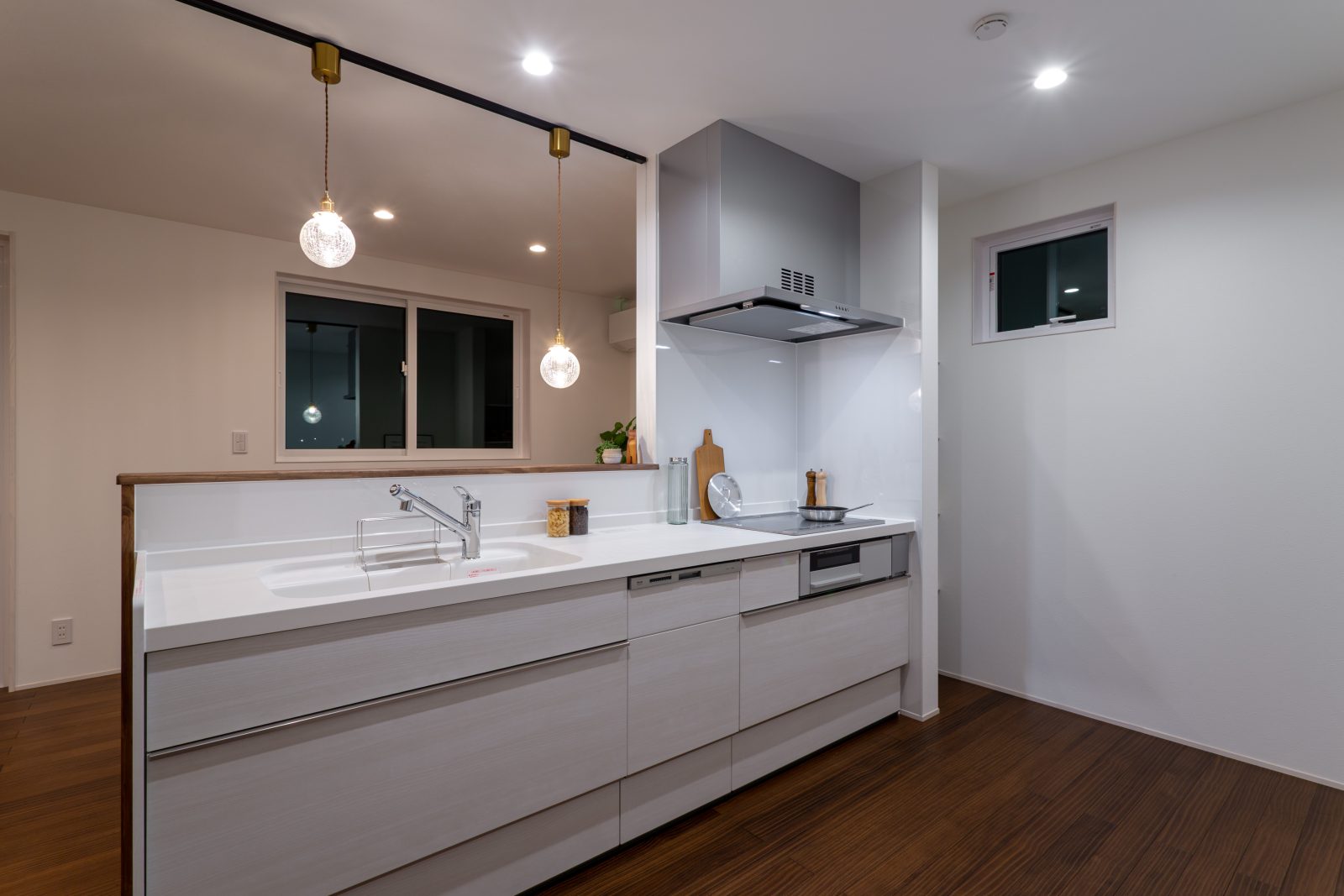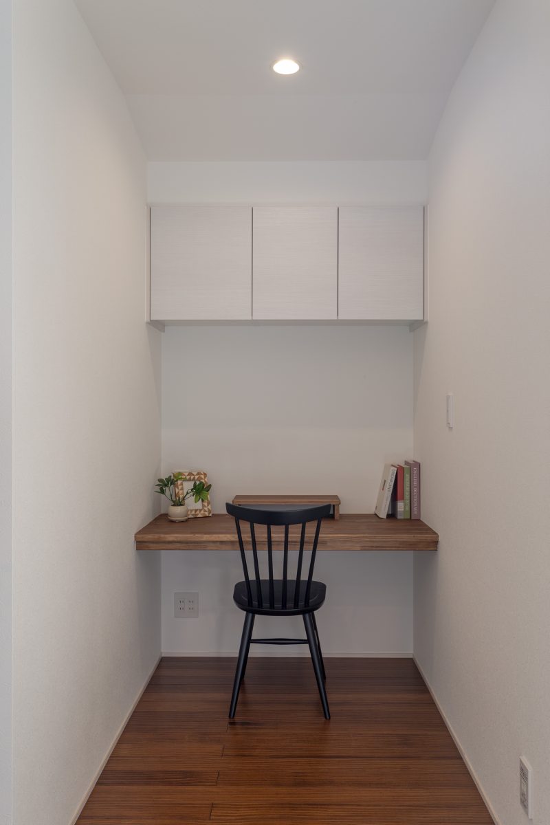 デッドスペースや隙間を有効活用した書斎 新たに一部屋設ける必要がなく無駄のない間取りとなっています カウンター上部をオープンの棚ではなく吊り戸棚にすることで、書籍などもすっきりと収納できます。