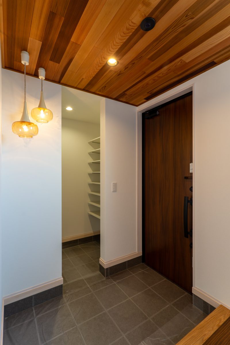 琥珀色の照明と木目の天井が温かみのある玄関を演出