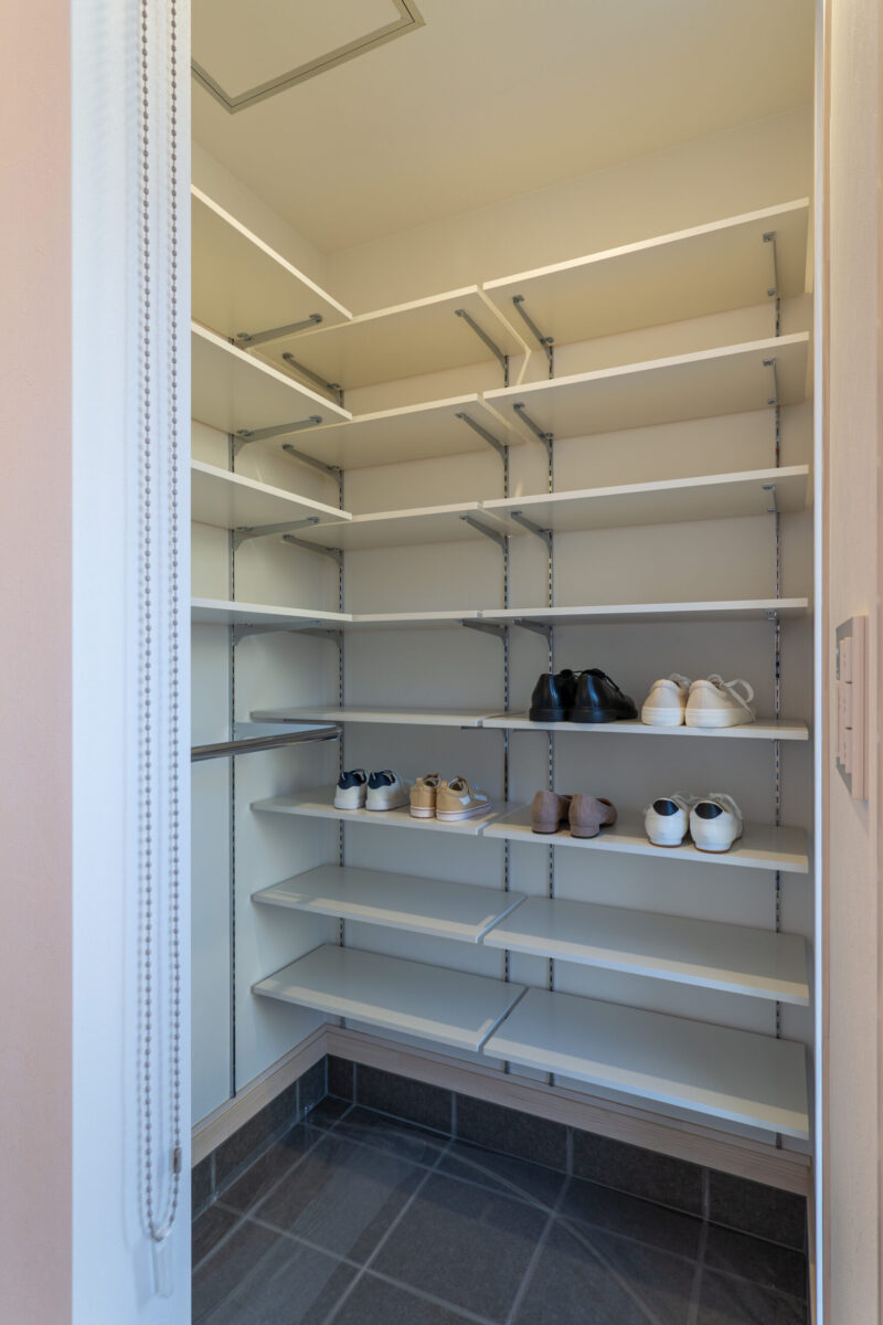可動棚で収納量も調整しやすく、使うものをすぐ手に取れる家事楽動線。